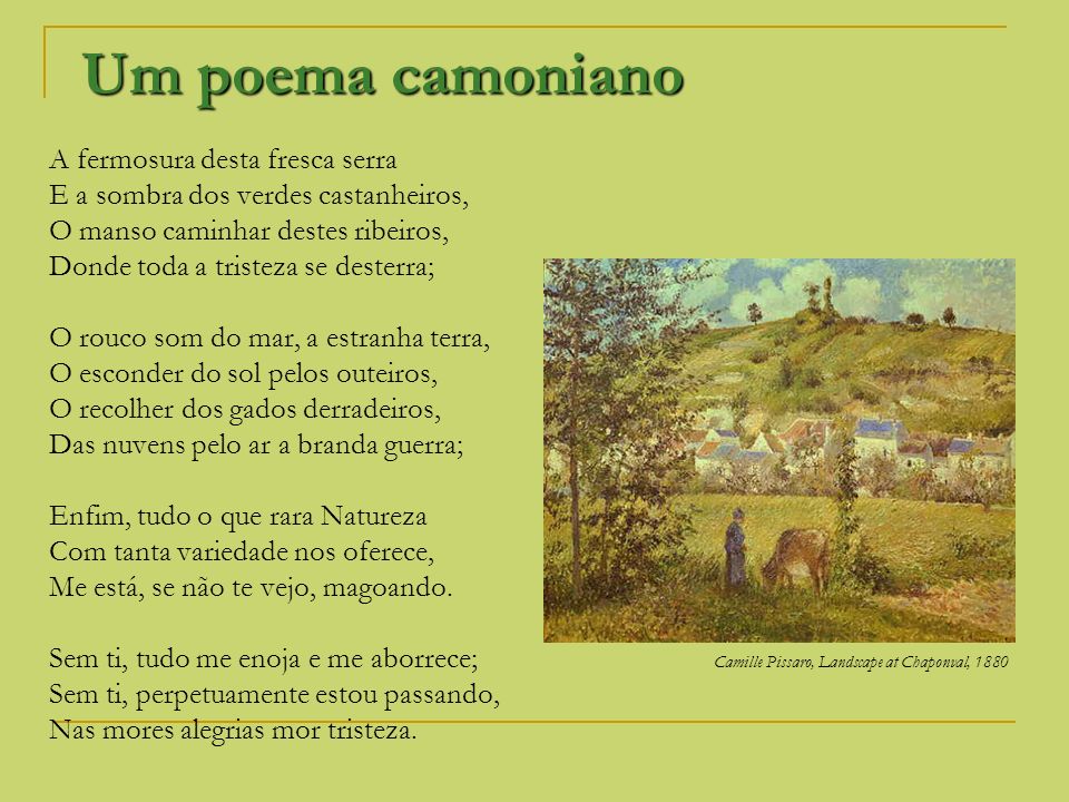 O soneto de Luís de Camões, que começa com o verso "A formosura desta fresca serra", descreve uma paisagem natural rica e harmoniosa, onde a serra, os castanheiros, os ribeiros e o pôr do sol compõem um cenário de grande beleza. Contudo, apesar da exuberância da natureza, o eu poético sente tristeza na ausência da amada. Este contraste entre a beleza natural e o sentimento interior realça a profunda ligação entre o ser humano e o ambiente que o rodeia.